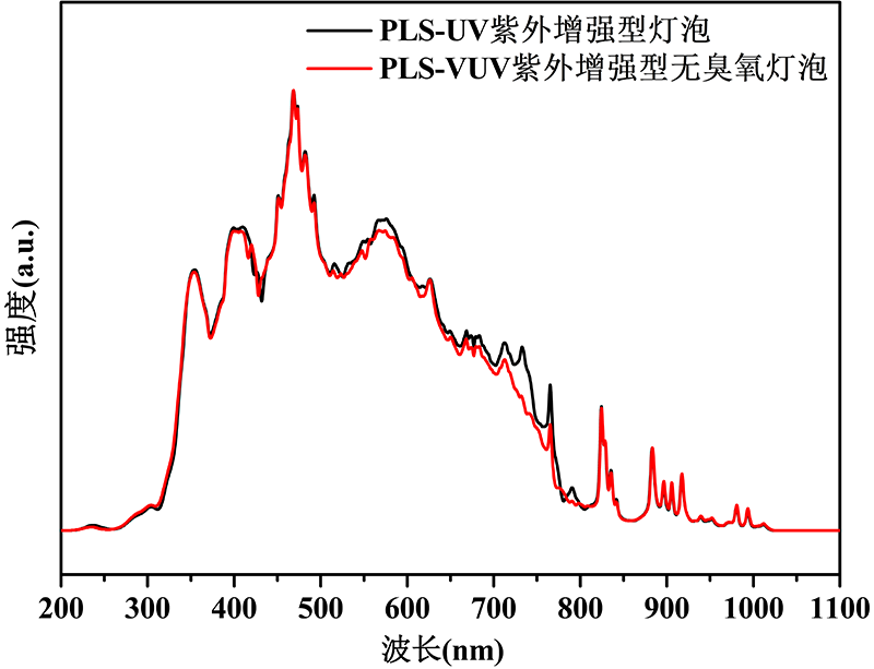 Figure 2. Comparison of Spectra between PLS-UV Ultraviolet Enhanced Lamp Bulb and PLS-VUV Ultraviolet Enhanced Ozone-Free Lamp Bulb