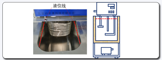 (3) Open the upper cover of the low-temperature constant temperature bath, and depending on the required temperature for the experiment, fill it with different solutions such as pure water, 15% glycerol solution, or ethylene glycol. Refer to the notes for filling the solution for specific choices. Ensure that the minimum filling level keeps the refrigeration coil completely below the liquid level;